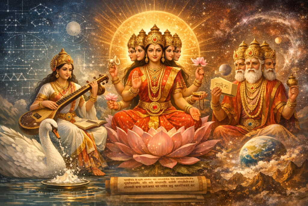 ब्रह्मा का चतुरानन रूप इस समग्रता का प्रतीक है। चार मुख केवल चार दिशाओं का संकेत नहीं, बल्कि यह दर्शाते हैं कि सृजन के लिए बहु-दृष्टिकोण (Multiple Perspectives) आवश्यक है। आज के interdisciplinary research में भी यही सिद्धांत लागू होता है—किसी जटिल समस्या को हल करने के लिए विभिन्न क्षेत्रों की दृष्टि आवश्यक होती है।
